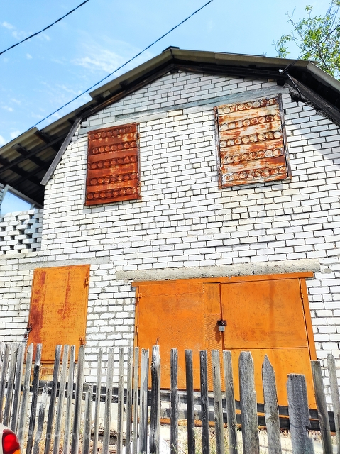 На первом этаже – гараж с железными дверями.