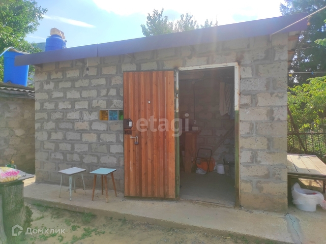 На участке - хозпостройка из блоков, деревянный туалет.