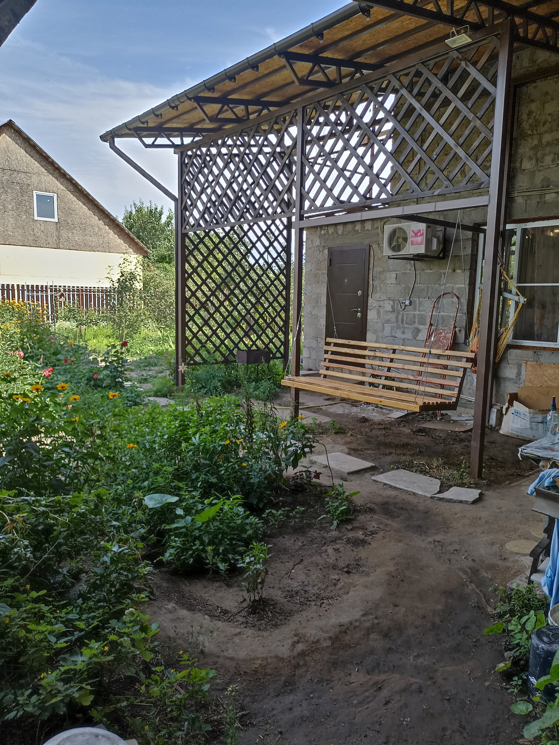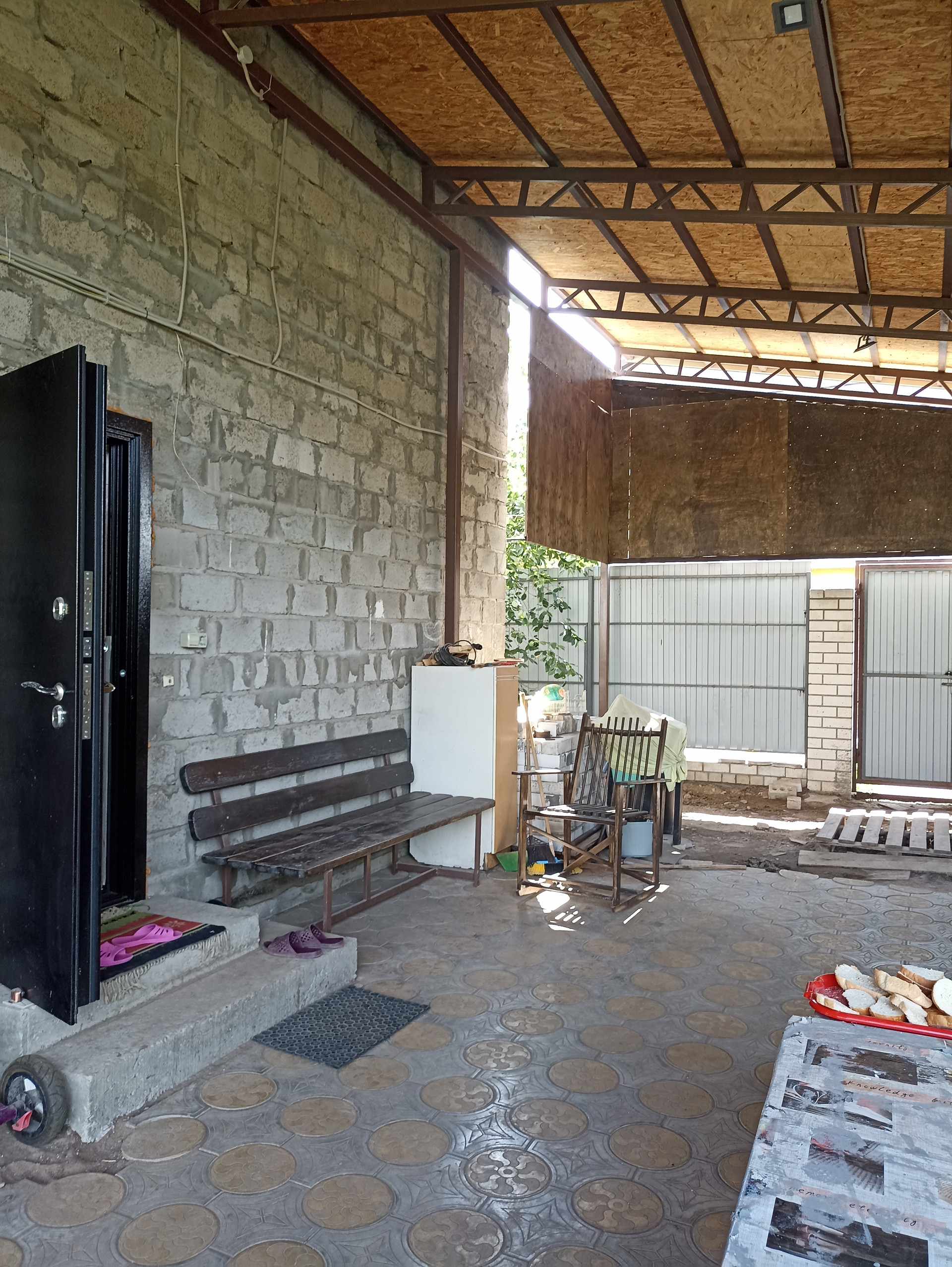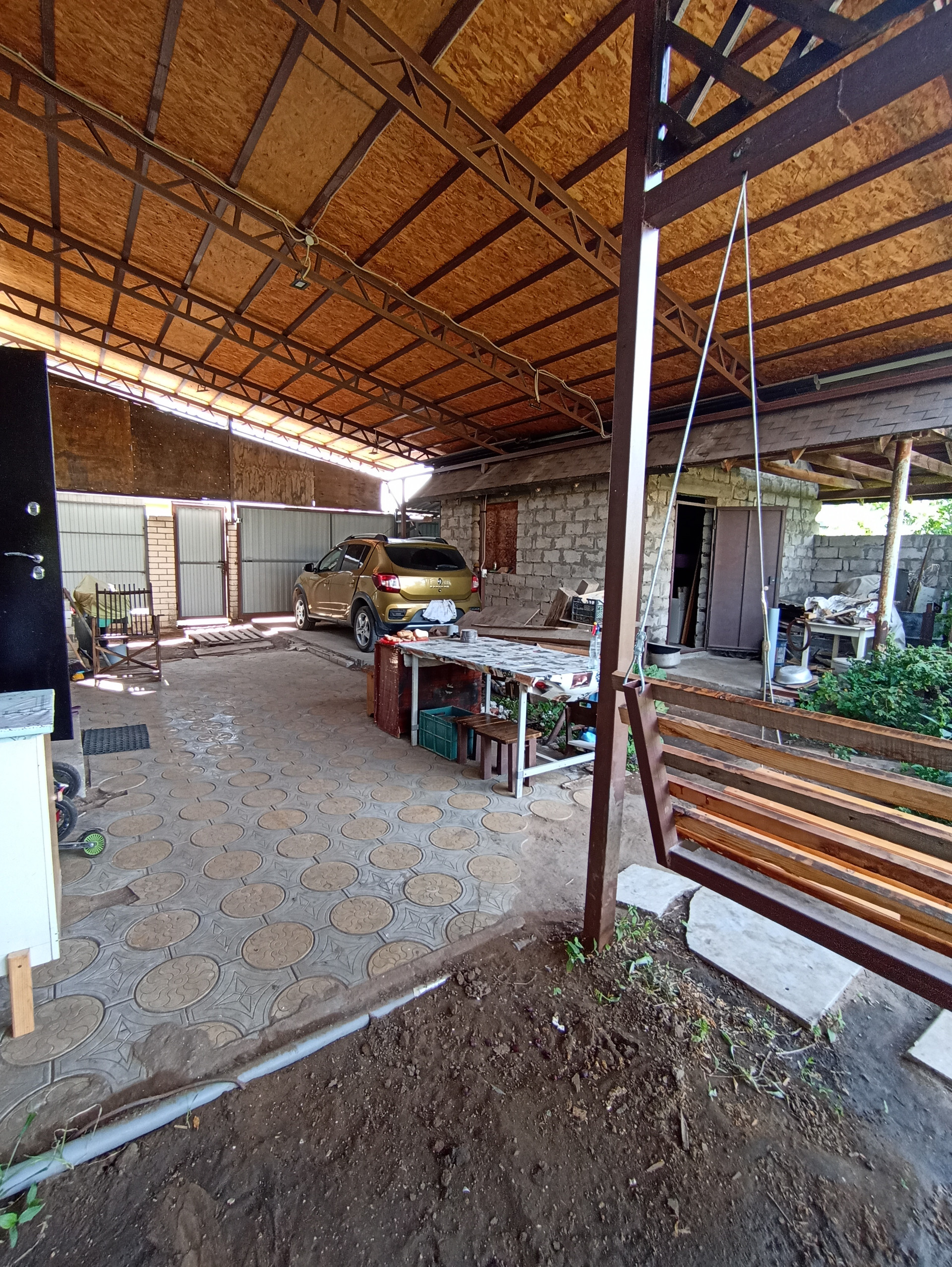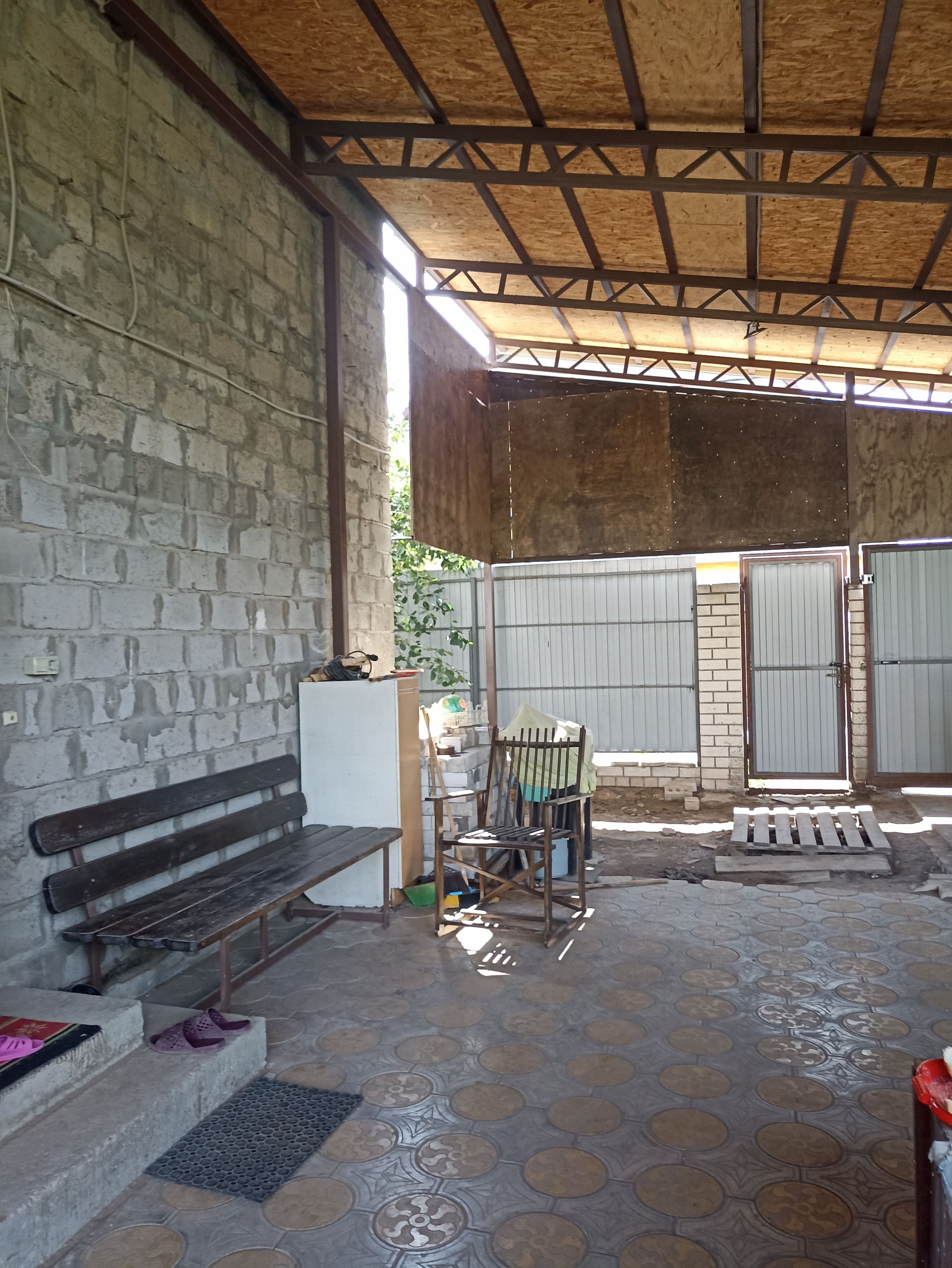 Большой навес связан с крышей дома и баней. Баня недостроенная, "коробка". В баню заведена городская вода и свет. Есть небольшой бассейн без отделки.