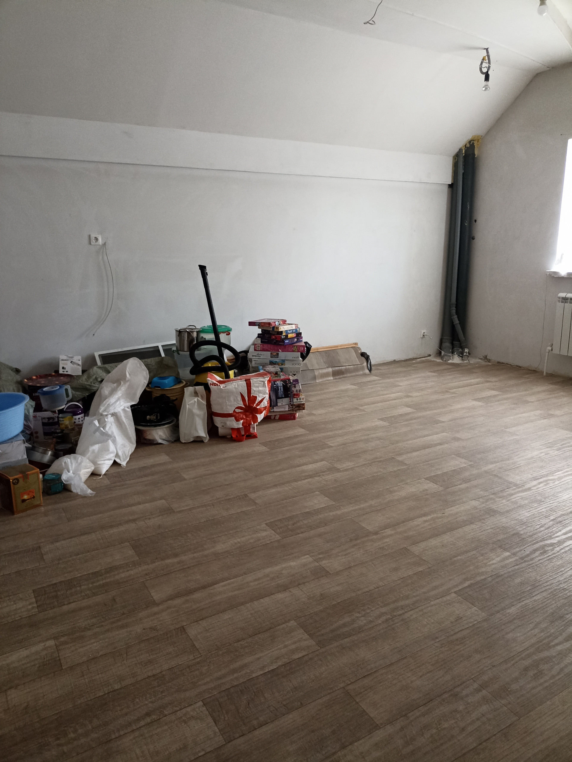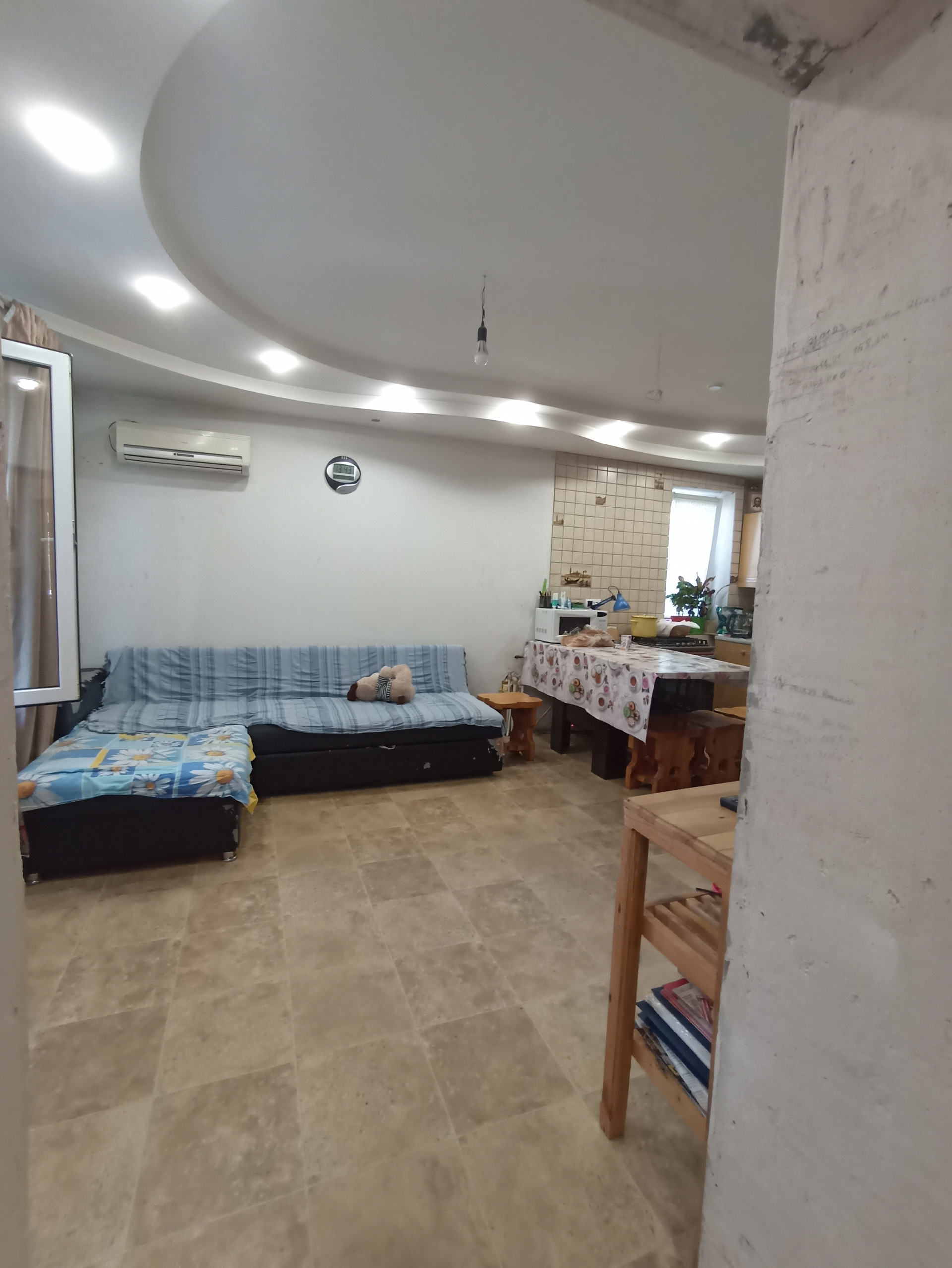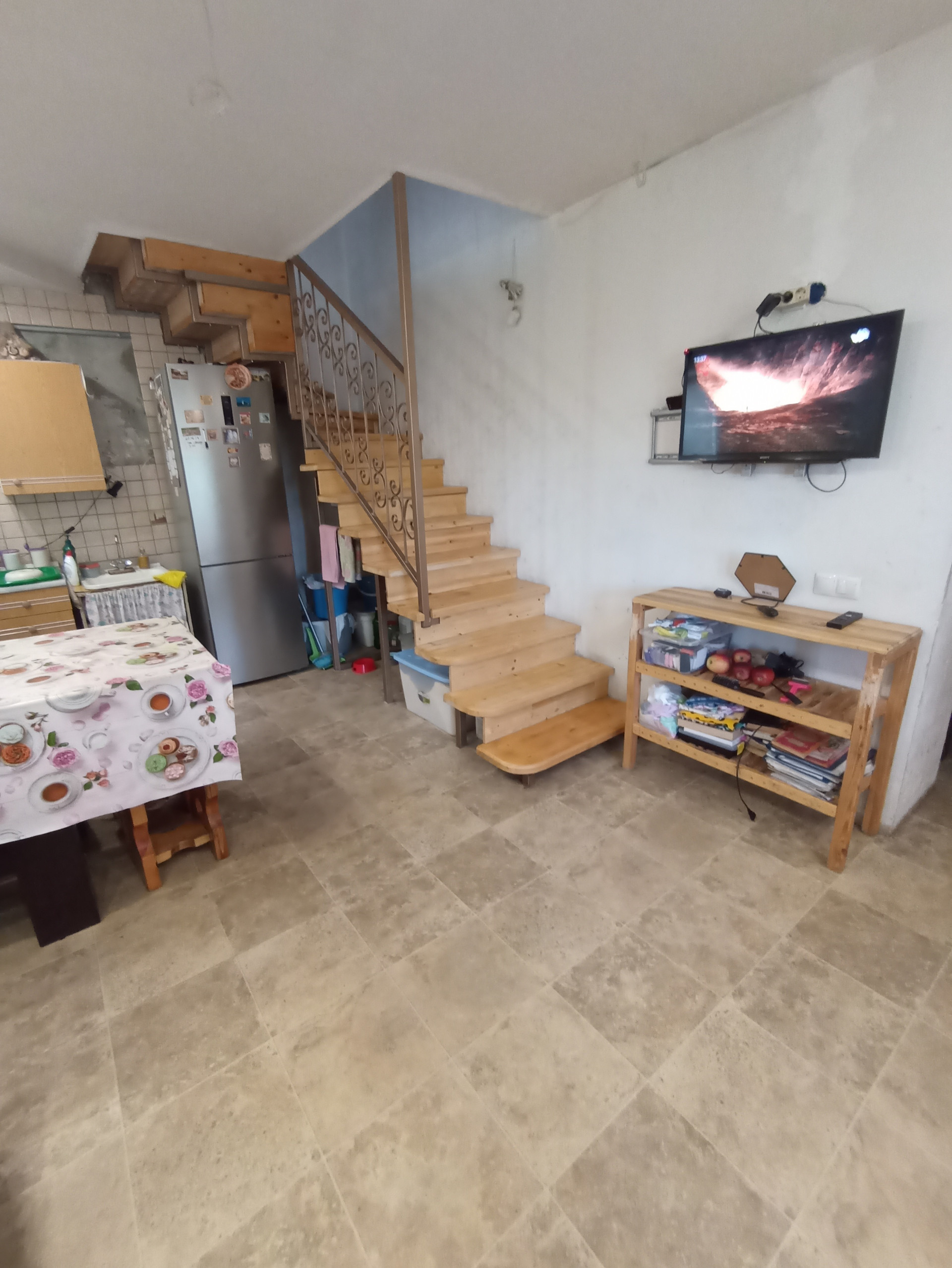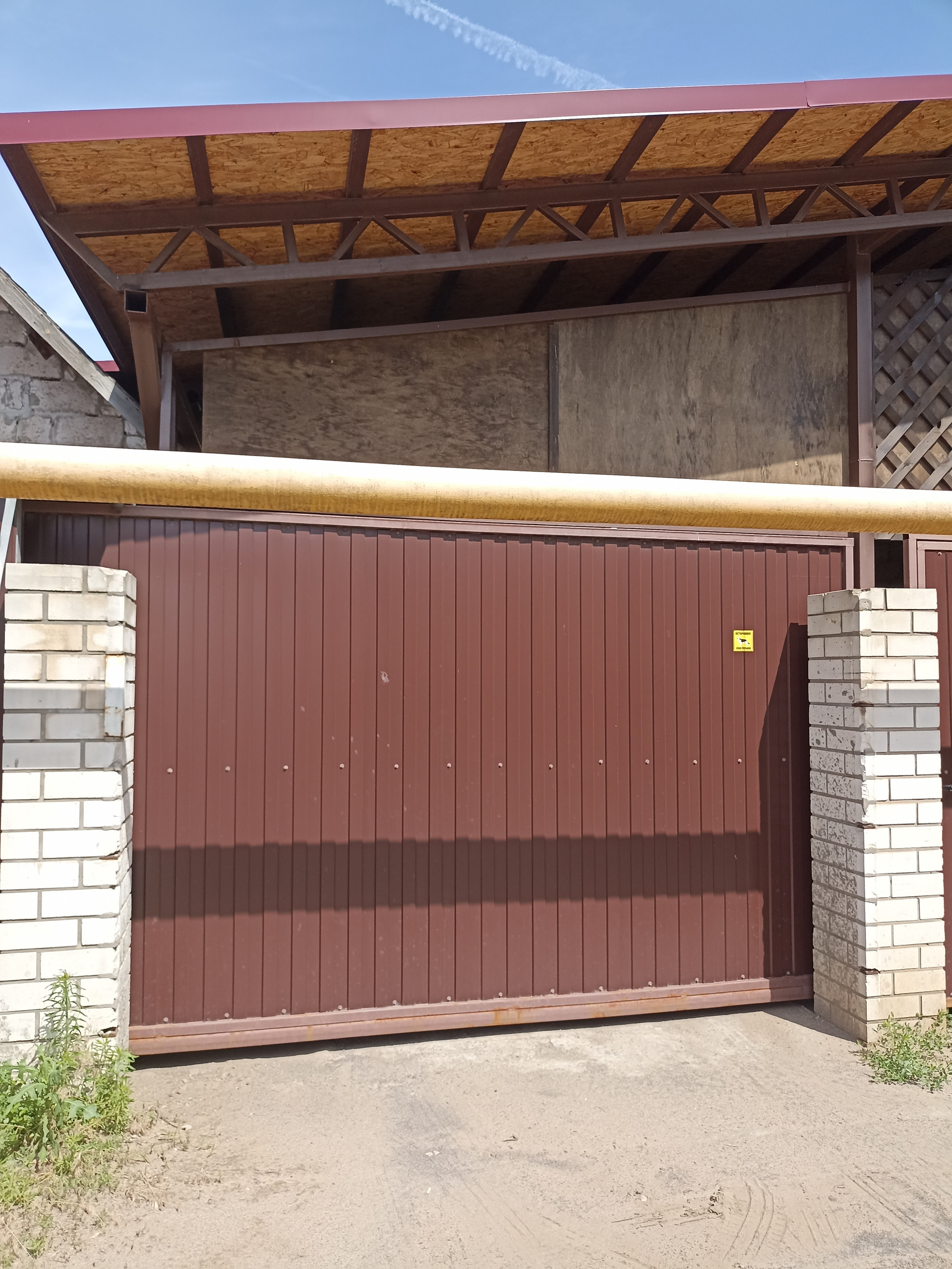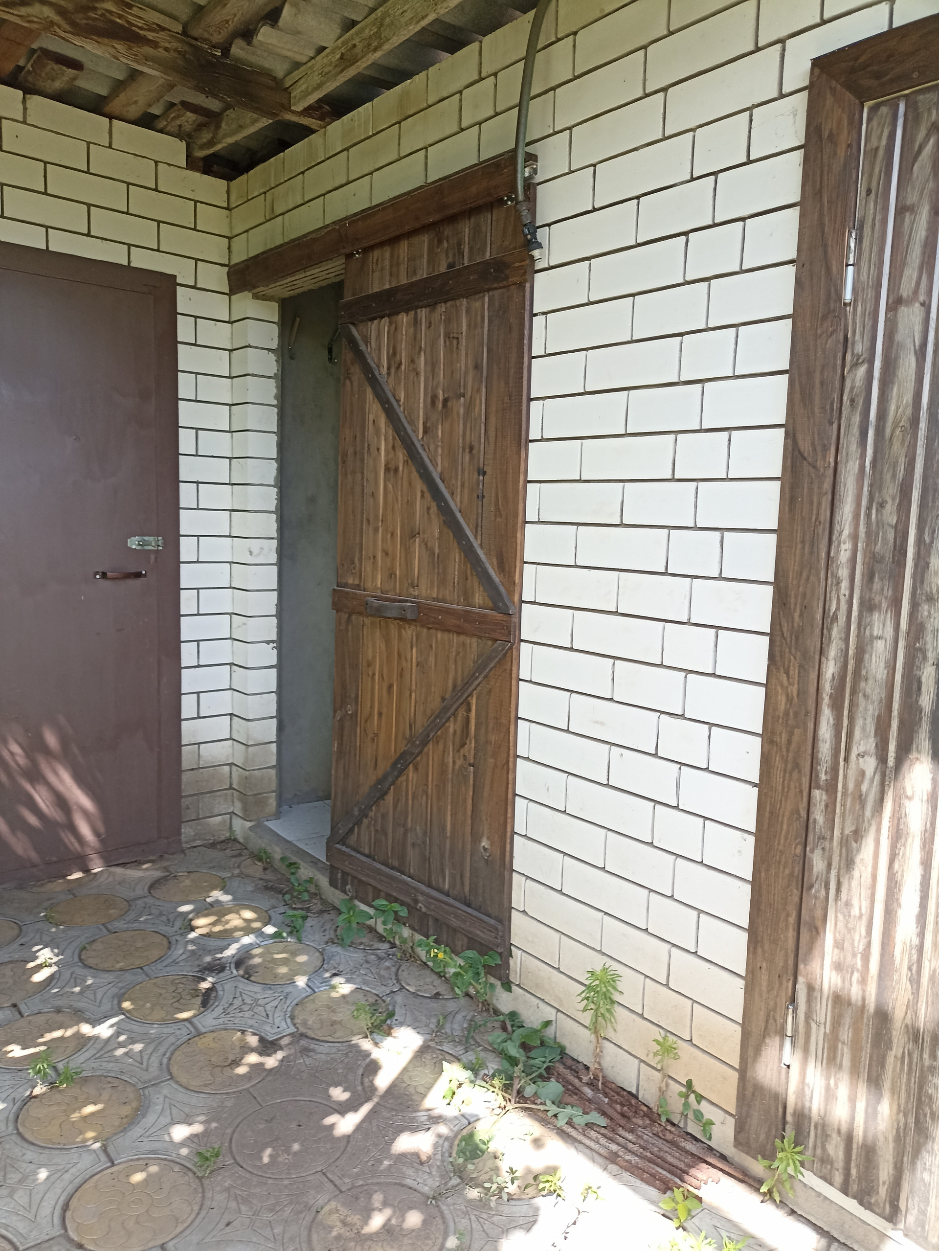 Большой навес связан с крышей дома и баней. Баня недостроенная, "коробка". В баню заведена городская вода и свет. Есть небольшой бассейн без отделки.