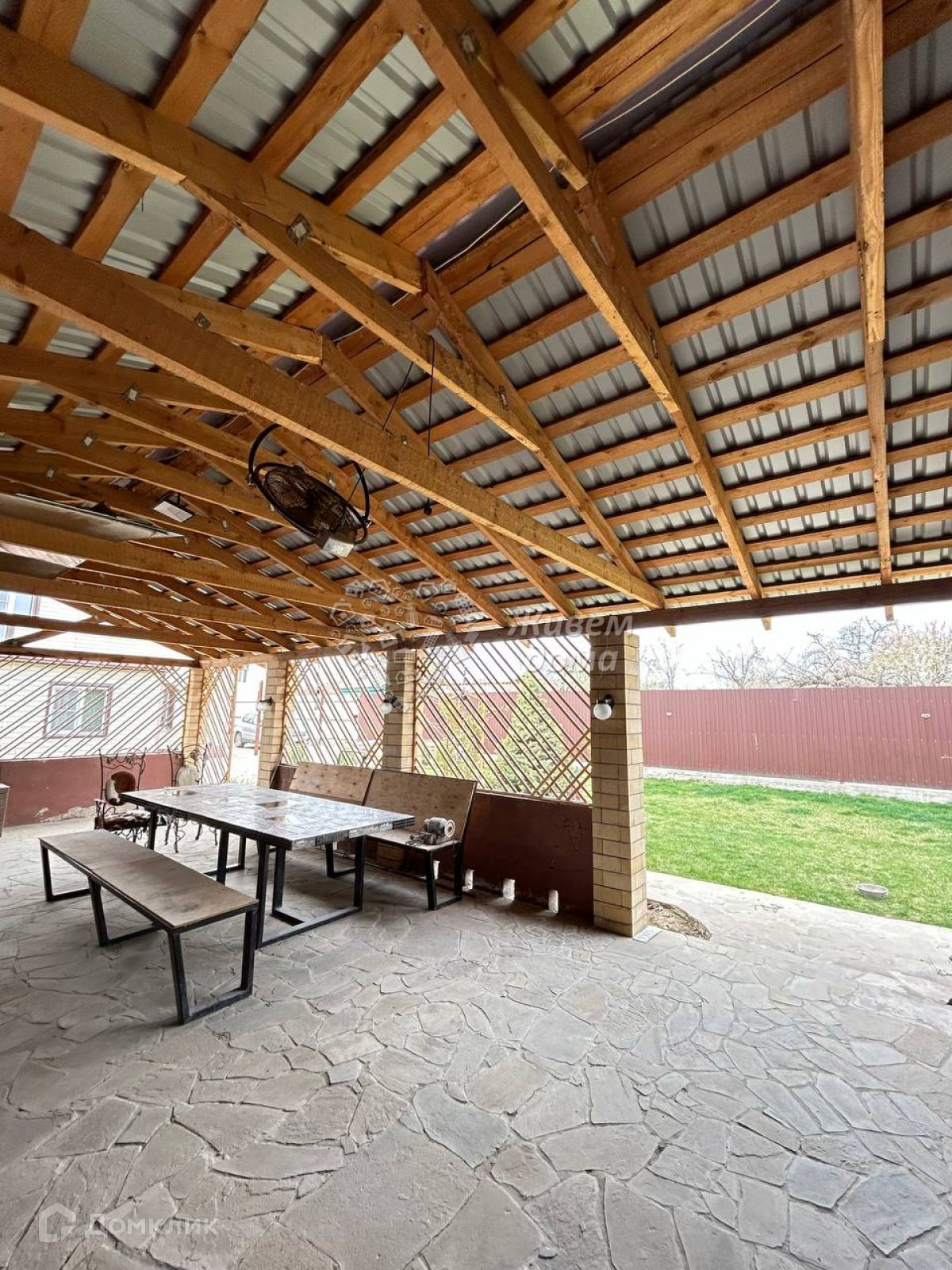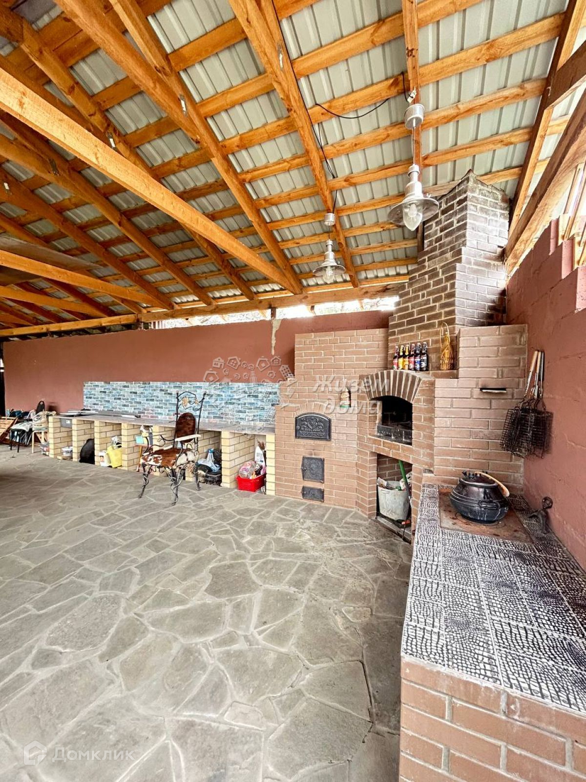 Зона отдыха с оборудованной кухней и санузлом. Теплый пол. Большая беседка (60кв.м) с мангальной зоной. Участок ровный, благоустроенный.
