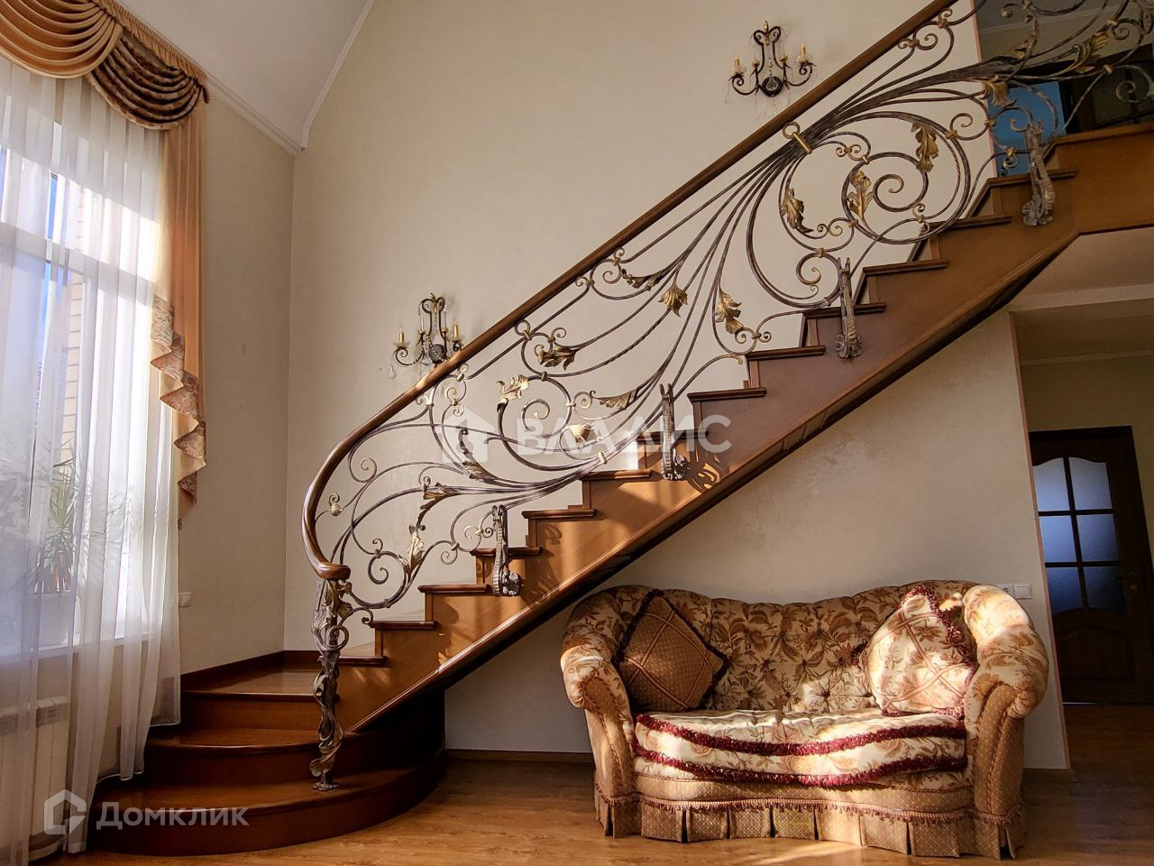 Лестница на второй этаж выполнена из массива дуба, перила выкованы по индивидуальному заказу. Двери – натуральный дуб. Первый этаж оформлен венецианской штукатуркой, на полу ламинат.