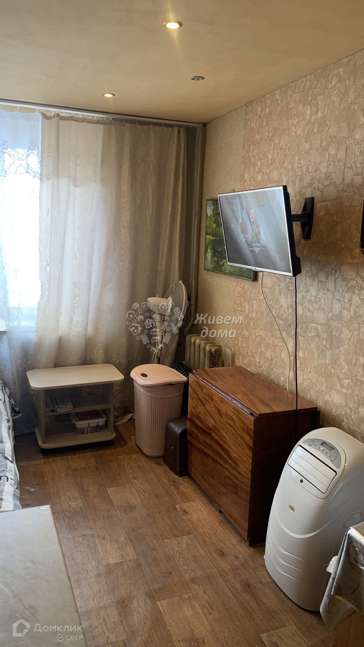 На полу залита бетонная стяжка, постелен линолеум. Комната поделена на 3 зоны, входная зона, кухонная зона с кухонный фартуком и  с кухонным гарнитуром и гостиная. Напольный кондиционер и кухонный гарнитур можем оставить по договоренности.