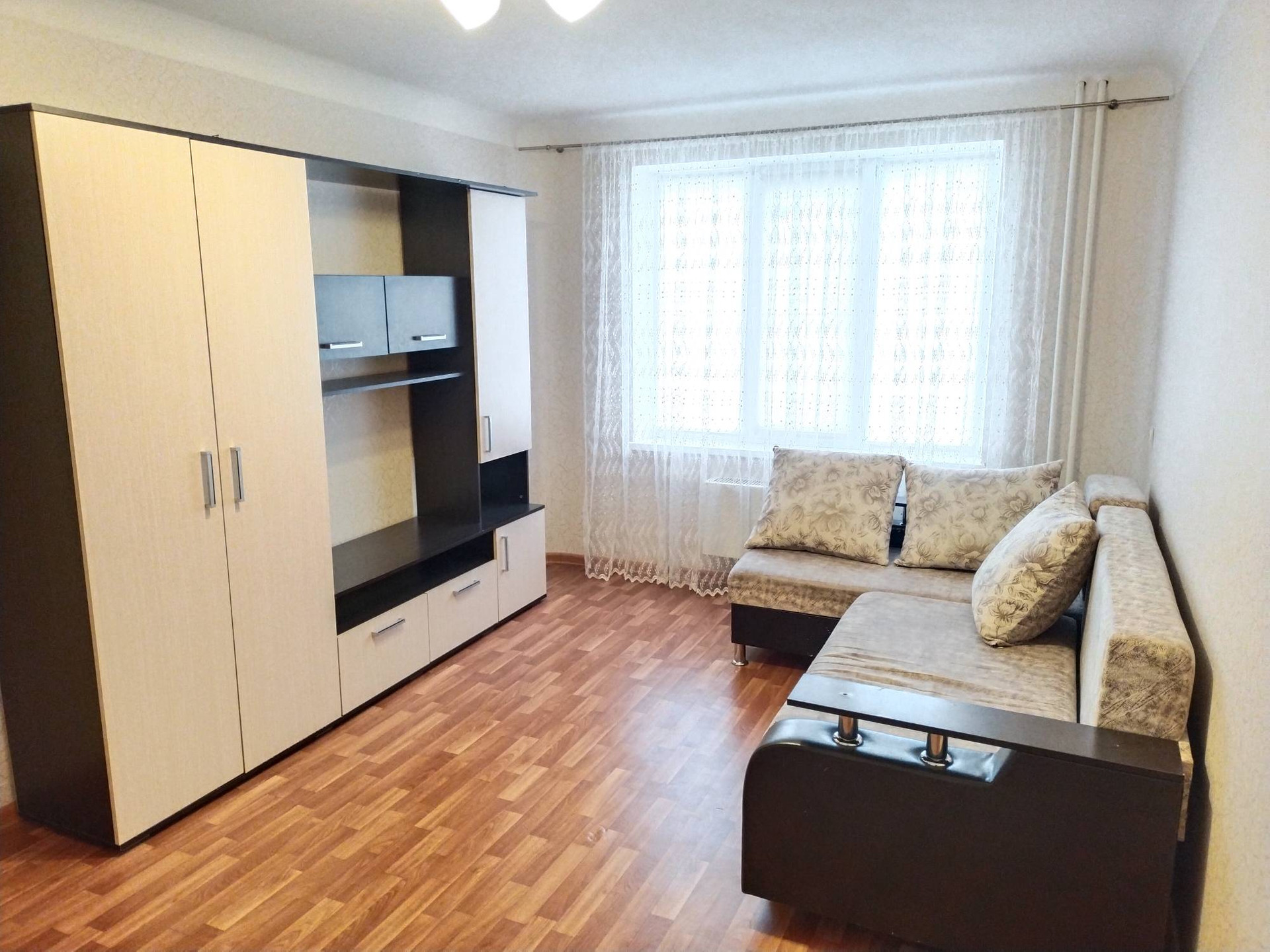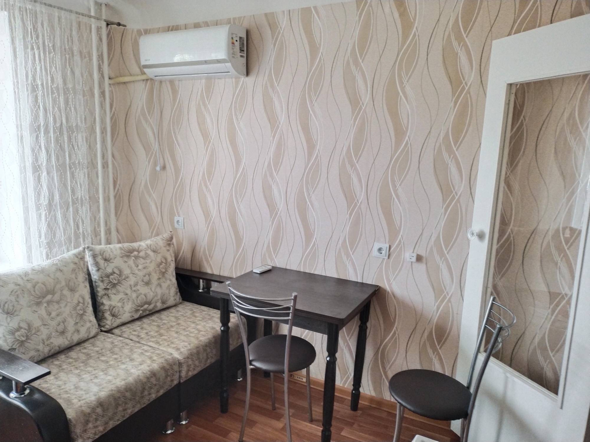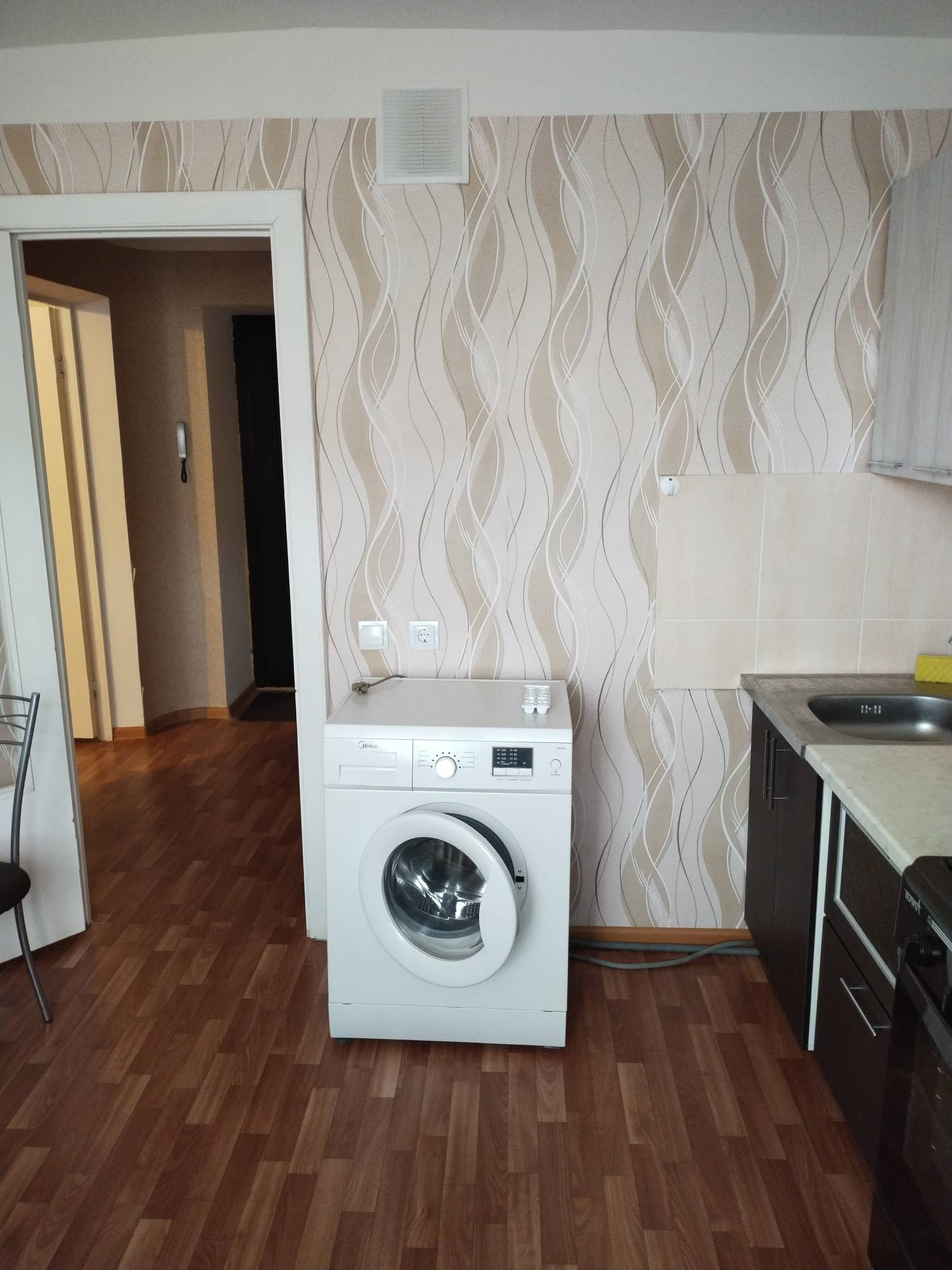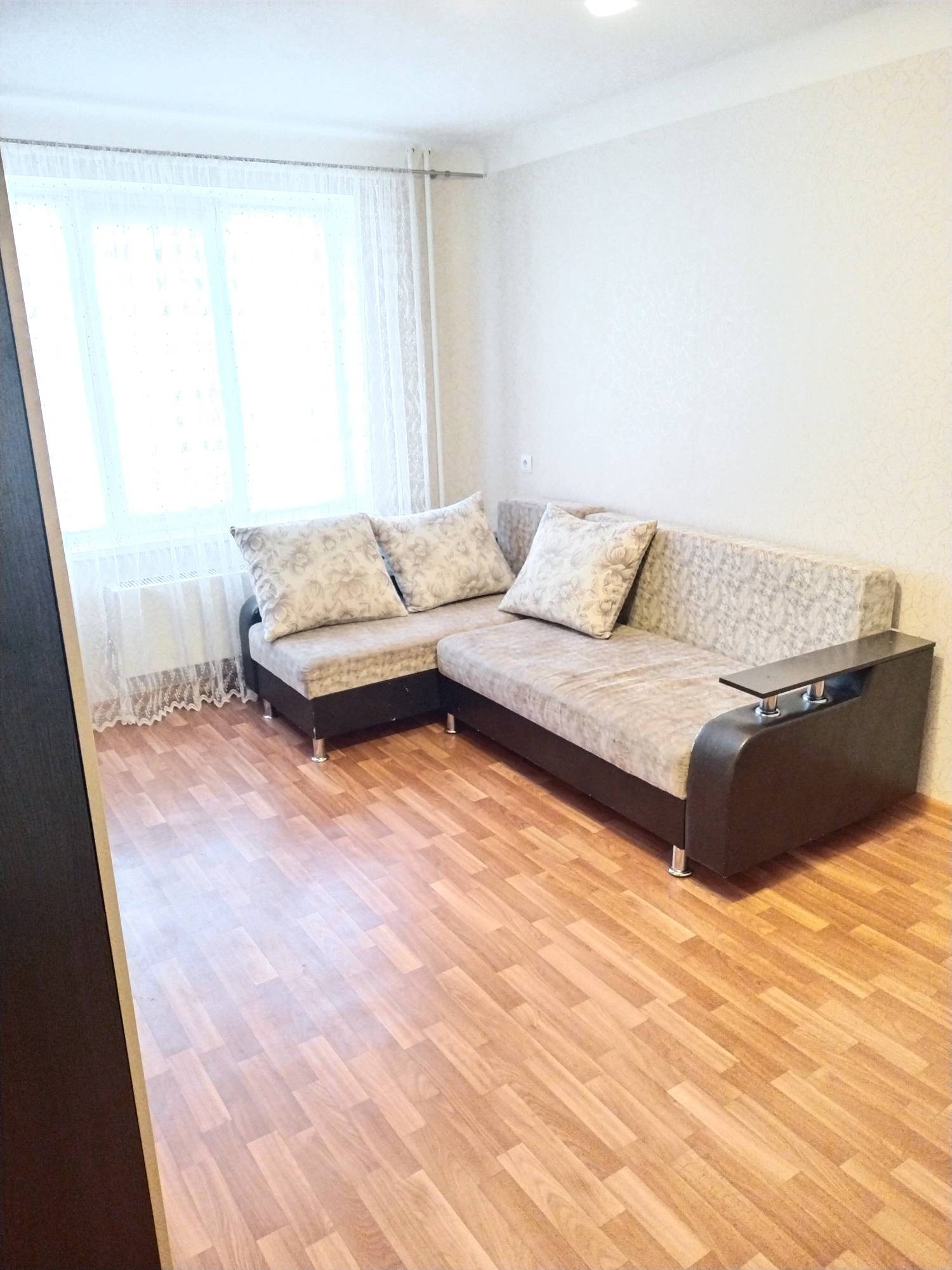 В квартире  кух гарнитур, микроволновая печь,холодильник, стир машинка, стол и табуретки, в комнате  диван, шкаф, мини горка, новая надежная  входная дверь Сан. узел совмещен, установлены счетчики на газ, воду и свет. Остальное по договоренности.