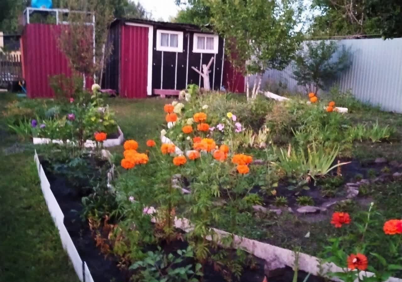 Забор из профлиста с 3-х сторон и с одной стороны деревянный, есть ворота для въезда автомобиля и место для стоянки. На участке плодовые деревья, кустарники, цветы многолетники. Есть место и для отдыха (например, поставить бассейн, мангал, качели), и для огорода. У калитки большой куст сирени.