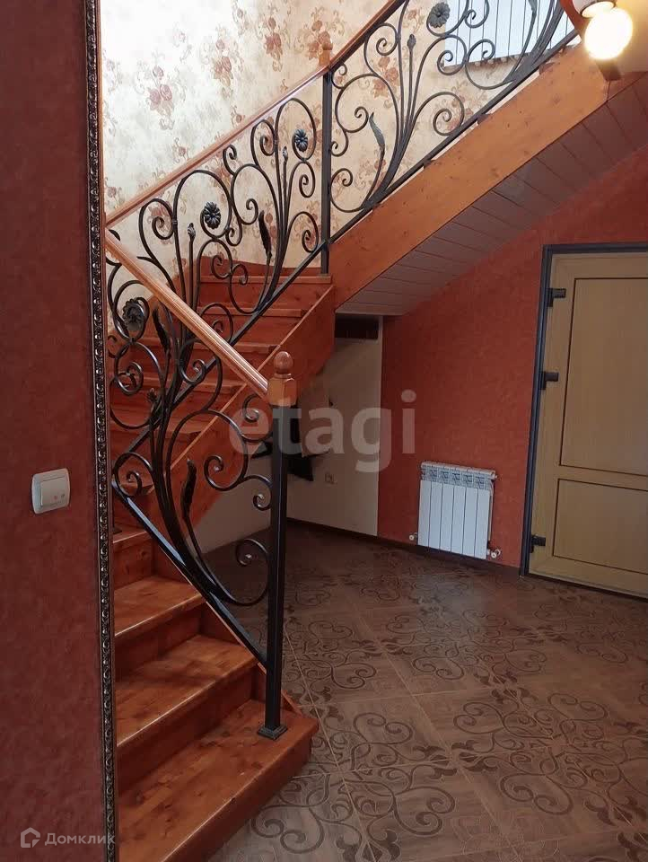 Лестница на второй этаж по металлическим косоурам с двумя площадками (безопасна для детей и пожилых людей) зашита деревом, перилла выполнены из кованных элементов ручной сборки.