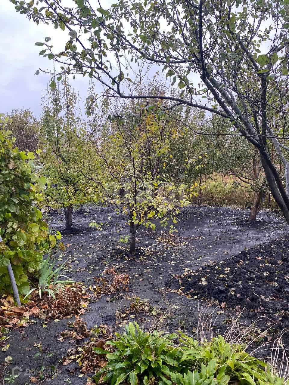 На участке посажены молодые деревья,виноград. Участок огорожен сеткой рабицей.