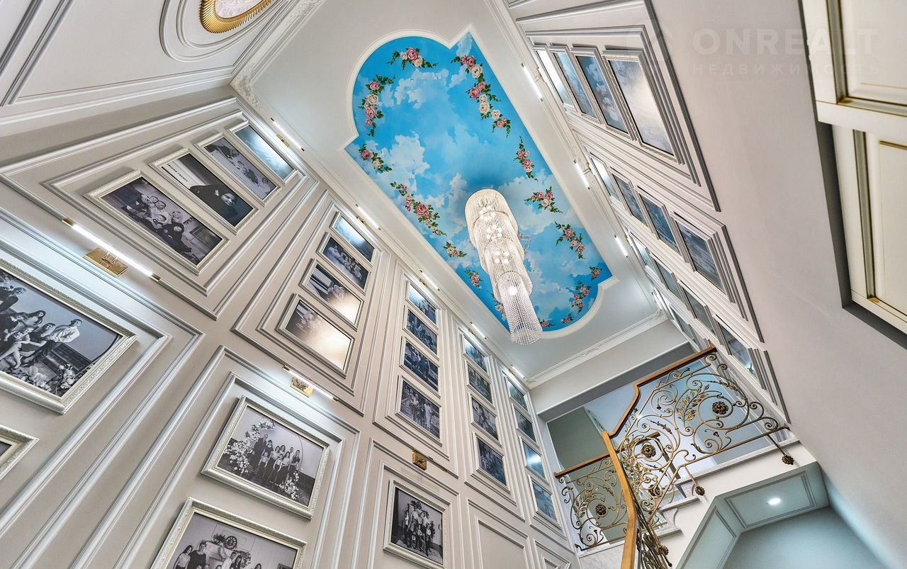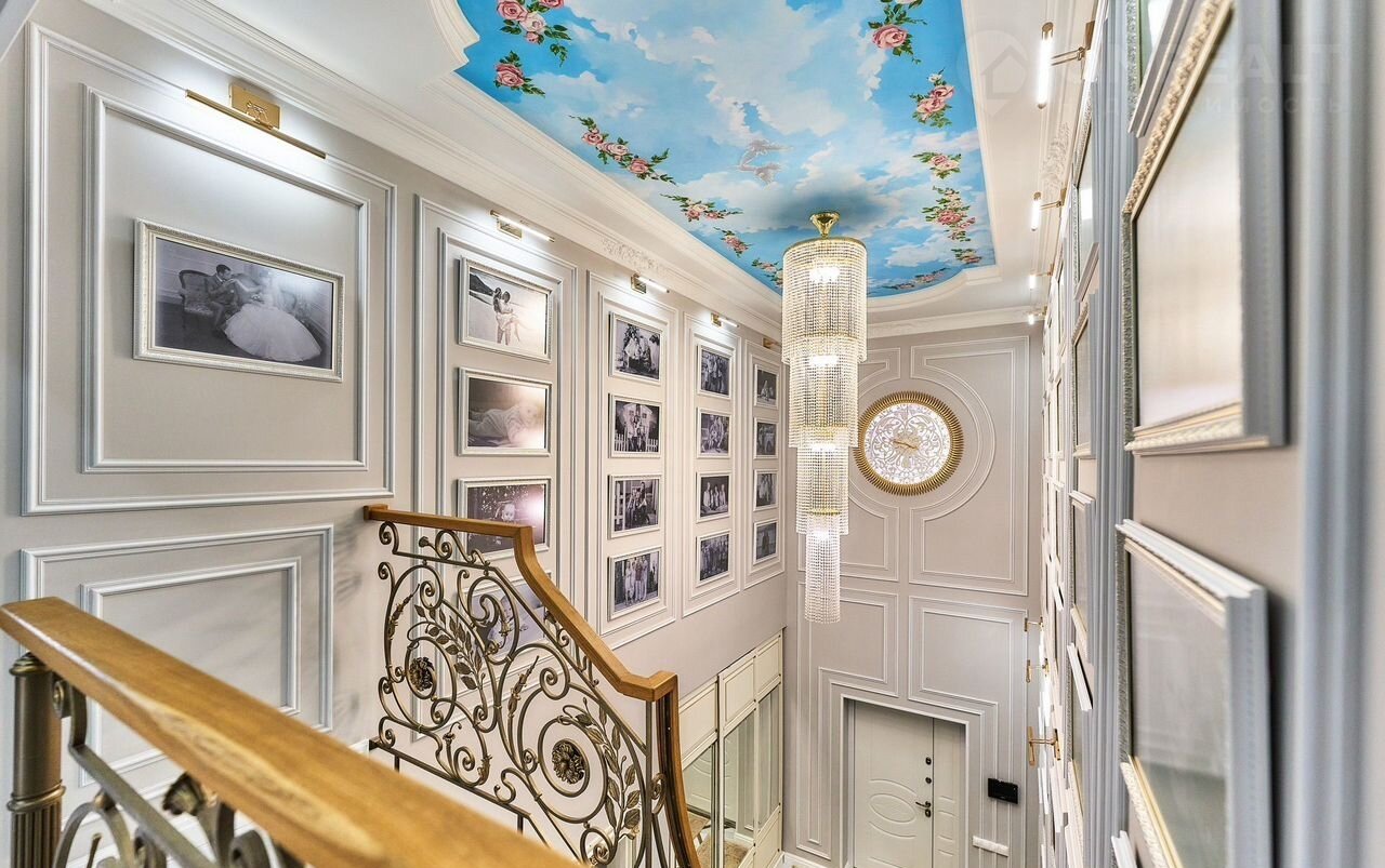 В зоне лестницы на потолке и оформлено красивое расписное панно ручной работы.