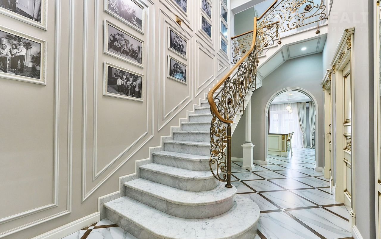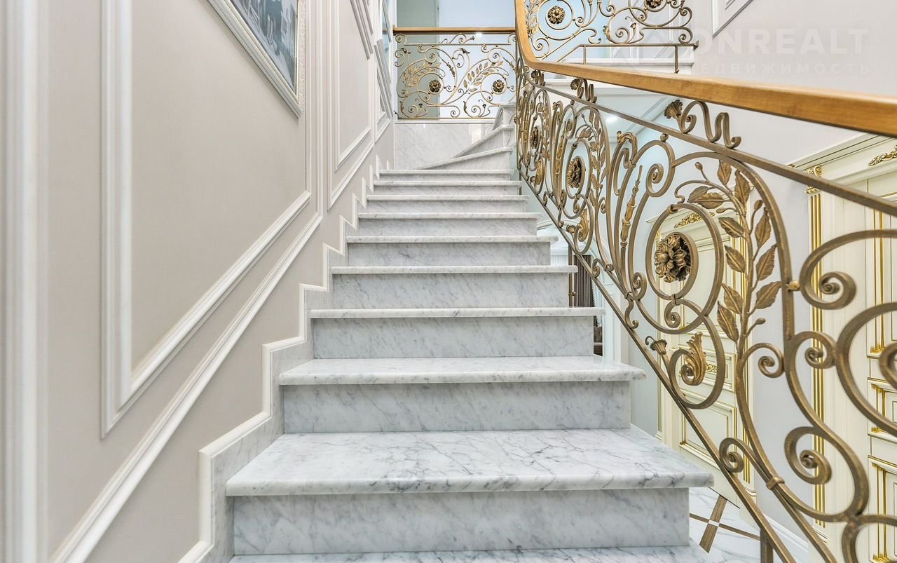 Первый и второй этаж соединяет монолитная лестница, отделана камнем. Перилла - ковка ручной работы с элементами натурального дерева.