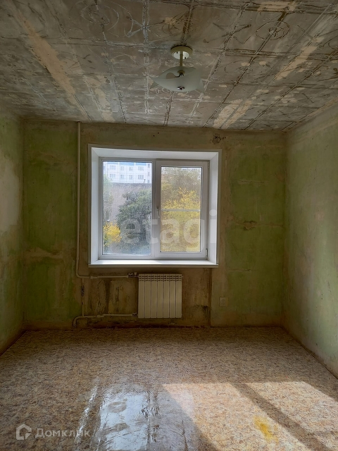 В комнате новая электропроводка, пластиковое окно, биметаллическая батарея отопления и металлическая дверь. Осталось только наклеить обои и натянуть потолок.