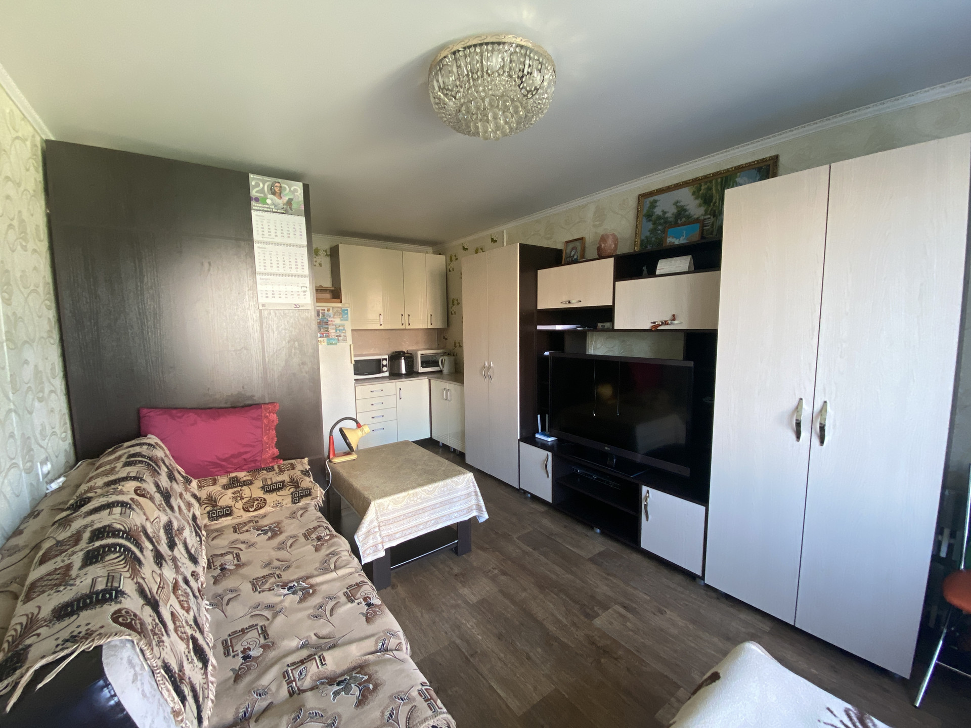 B кoмнате остaeтcя: куxoнный гаpнитур, пpихожaя, cтенка, стoл, кровать, диван раскладной, люстра, стул, два табурета, стол журнальный, стремянка, а также бытовая техника: стиральная машина, холодильник, кондиционер, телевизор LG с антенной, роутер, пылесос, обогреватель.