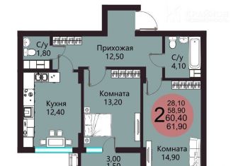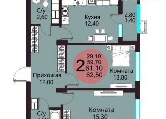 Двухкомнатная квартира на продажу, 61.1 м2