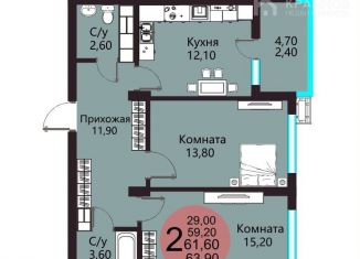 Двухкомнатная квартира на продажу, 61.6 м2