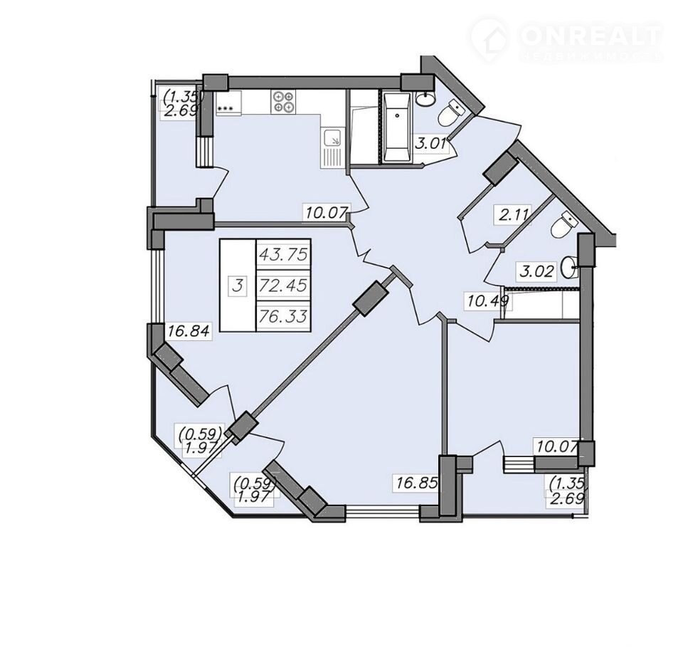 2-комнатная квартира, 73 м2, этаж 13 / 13, на продажу в Воронеже, Волгоградская улица, 45