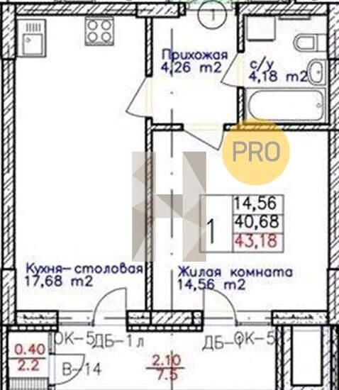Общая площадь 43.2 м2