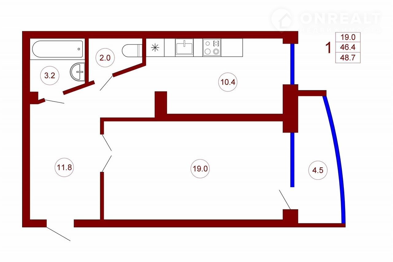 Общая площадь 48.7 м2