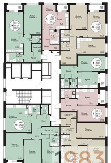 • Планировки: В доме 70 квартир: 1-, 2- и 3-х комнатные квартиры.