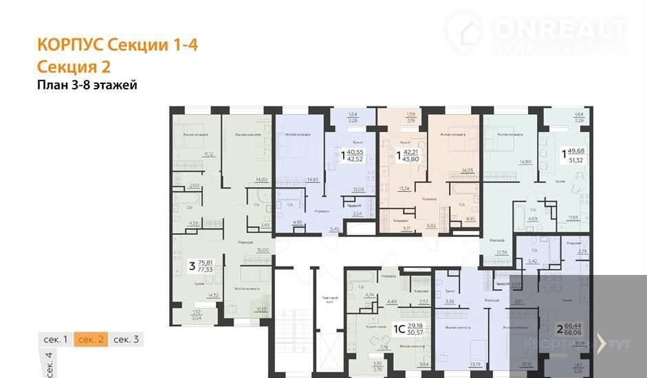 Квартира: 2 к 68,06 кв.м., 3 этаж в комплексе Заря, 1 очередь, корп.Секции 1-4, сдача: 2кв. , этажей: 16, адрес Воронеж г., Ленинградская ул., д. 29б, Застройщик: Развитие.