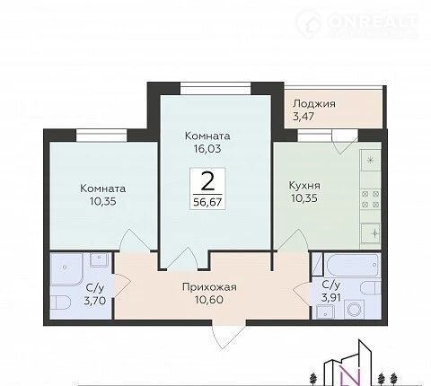 Общая площадь 56.6 м2