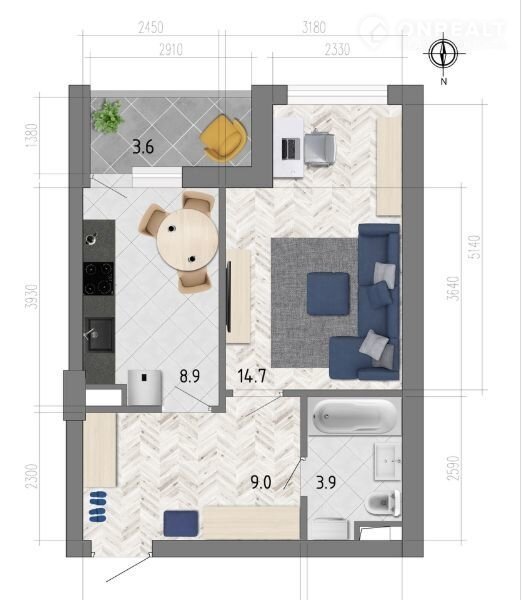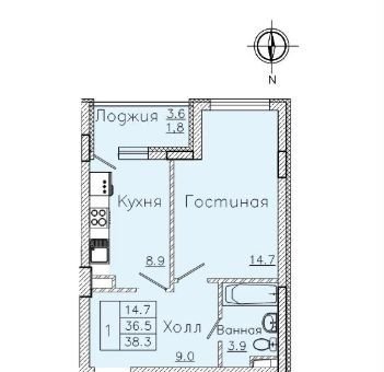 Общая площадь 38.3 м2