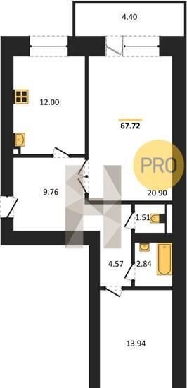 Общая площадь: 67,72 кв. м. Жилая площадь: 34,84 кв. м. Площадь кухни: 12 кв. м. Высота потолков составляет 2,68 метра, что добавляет пространству воздуха и света.