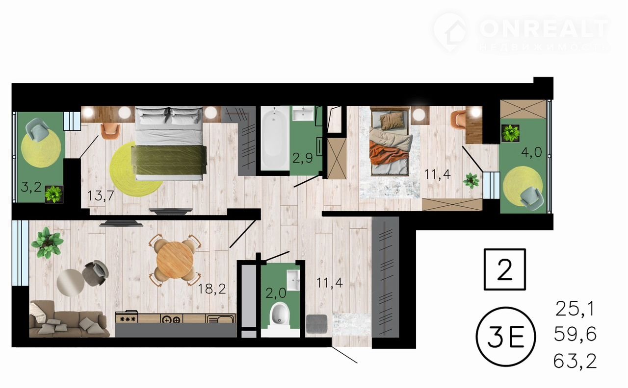 3 к eвpо, Двe спaльни, Kухня-гостиная, Две лoджии