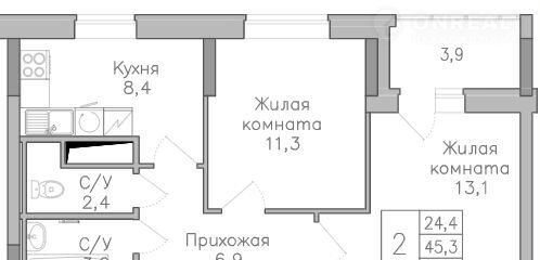 Жилая площадь 24.4 м2