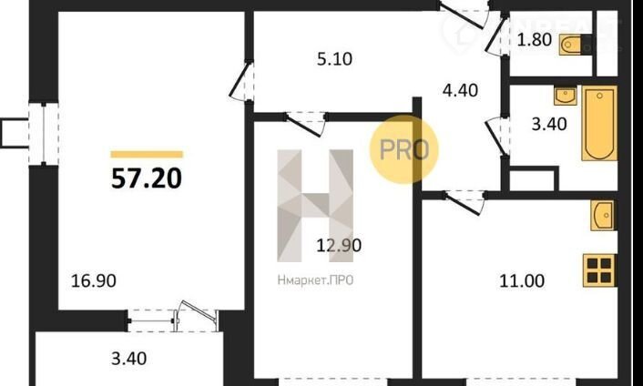 Общая площадь 57.2 м2
