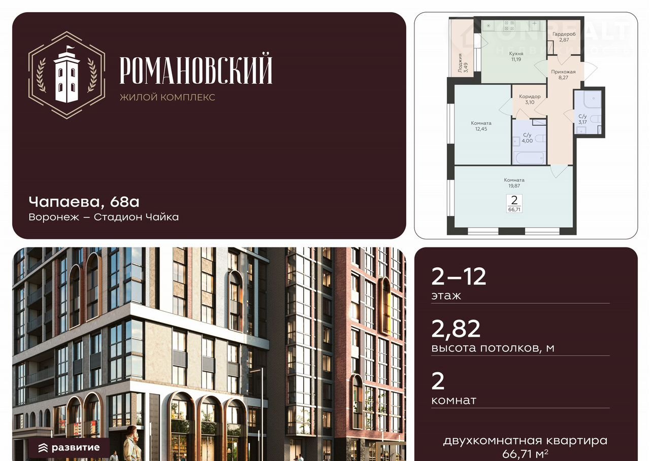 2-комнатная квартира, 66.7 м2, этаж 9 / 18, на продажу в Воронеже