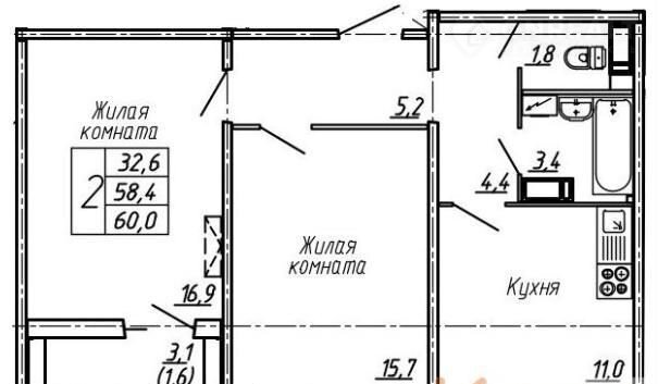 Жилая площадь 32.6 м2