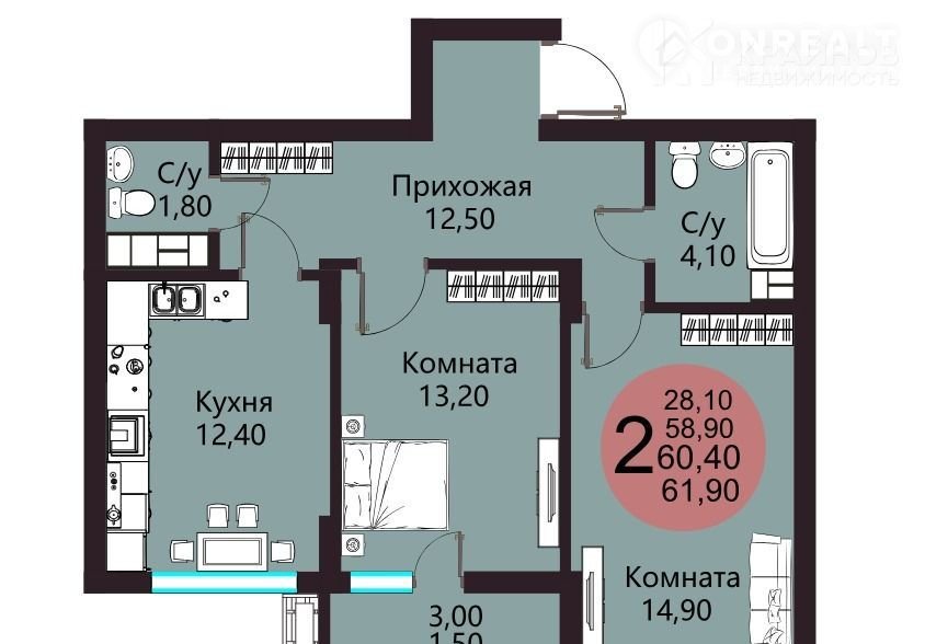 Общая площадь 60.4 м2