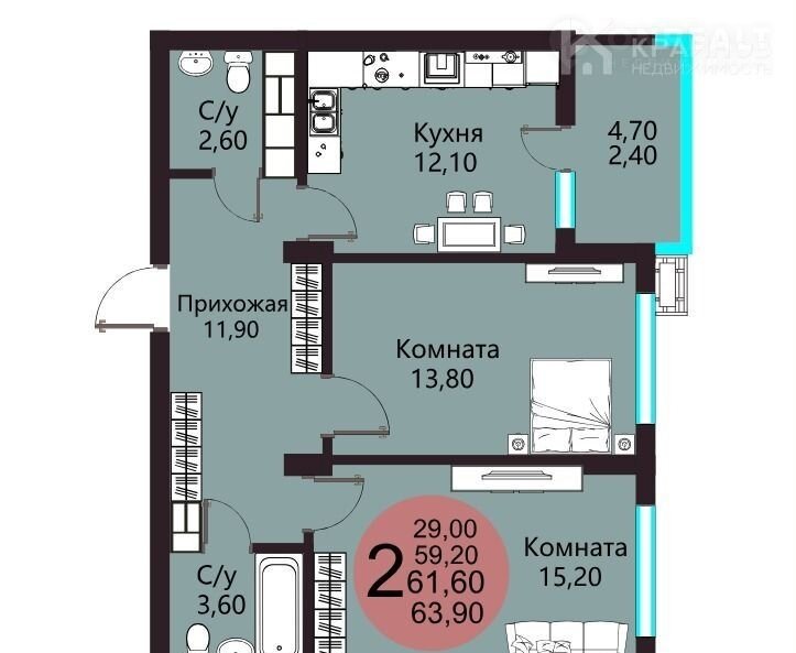 Общая площадь 61.6 м2