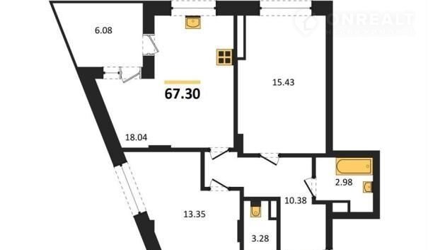 Квартира: 2 к 67,30 кв.м., 15 этаж в комплексе Зарядье, 1 очередь, корп.1 (Секции 4-8), сдача: 4кв. , этажей: 24, адрес Воронеж г., Электросигнальная ул., д. 9А, Застройщик: Развитие.