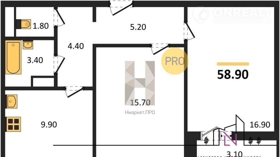 Общая площадь 58.9 м2