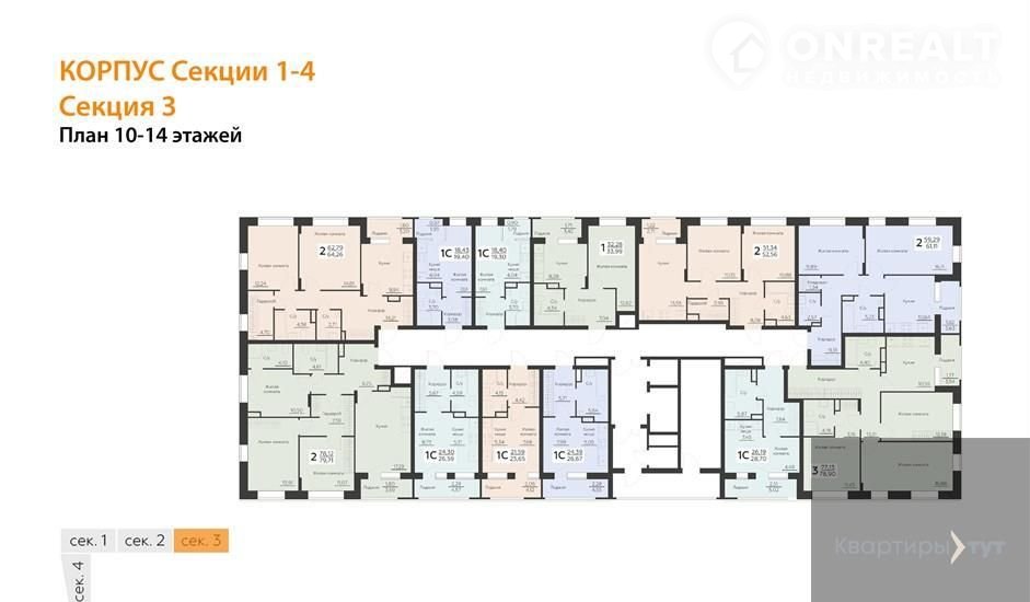 Квартира: 2 к 61,11 кв.м., 11 этаж в комплексе Заря, 1 очередь, корп.Секции 1-4, сдача: 2кв. , этажей: 16, адрес Воронеж г., Ленинградская ул., д. 29б, Застройщик: Развитие.