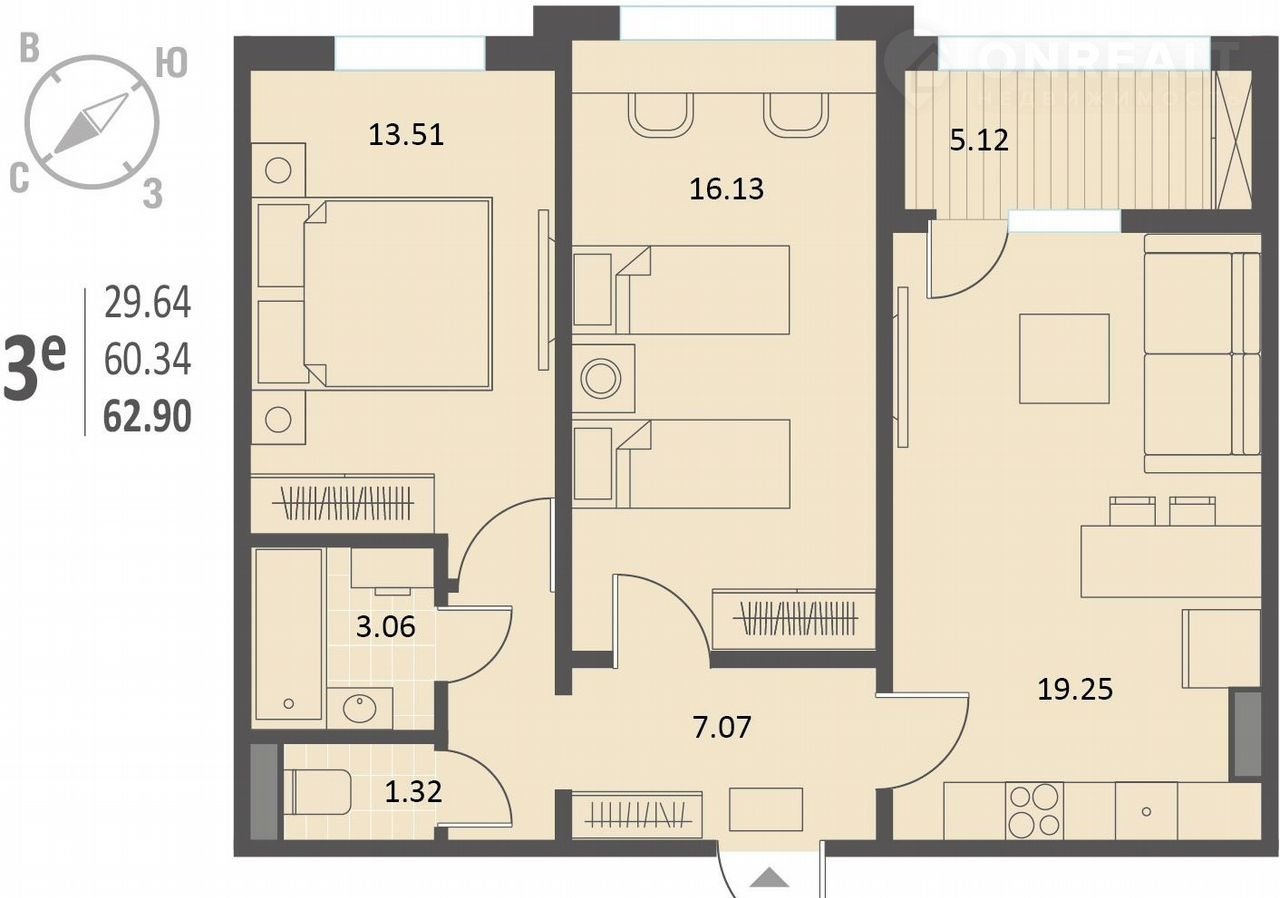Общая площадь 62.9 м2