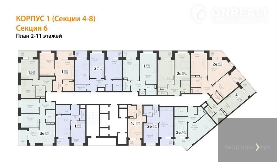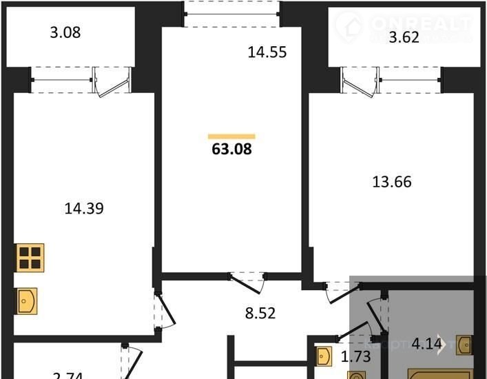 Квартира: 2 к 63,08 кв.м., 5 этаж в комплексе Зарядье, 1 очередь, корп.1 (Секции 4-8), сдача: 4кв. , этажей: 24, адрес Воронеж г., Электросигнальная ул., д. 9А, Застройщик: Развитие.