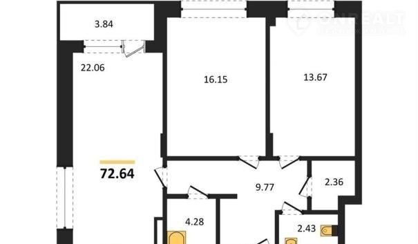 Квартира: 2 к 72,64 кв.м., 16 этаж в комплексе Зарядье, 1 очередь, корп.1 (секции 1-3), сдача: 4кв. , этажей: 21, адрес Воронеж г., Электросигнальная ул., д. 9А, Застройщик: Развитие.