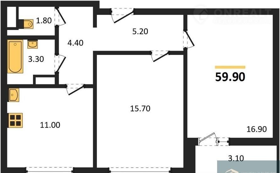 2-комнатная квартира, 59.9 м2, этаж 19 / 19, на продажу в Воронеже