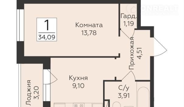 1-комнатная квартира, 34.1 м2, этаж 16 / 18, на продажу в Воронеже