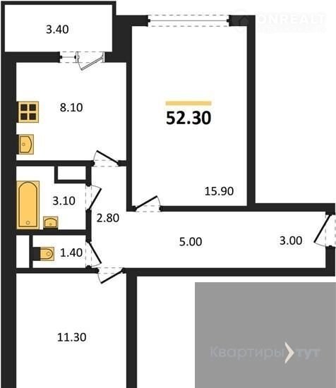 Общая площадь 52.3 м2