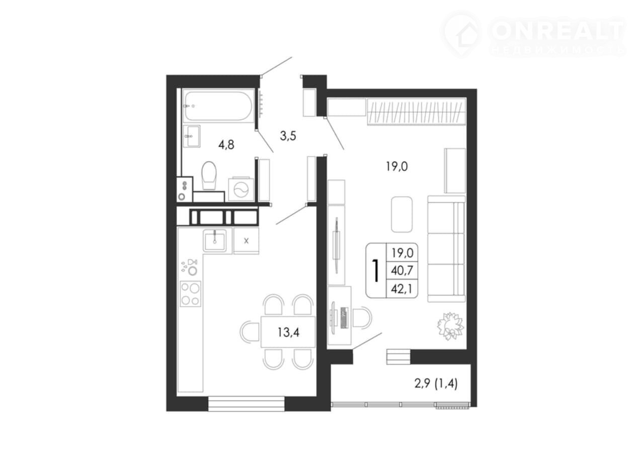 Общая площадь 42.1 м2
