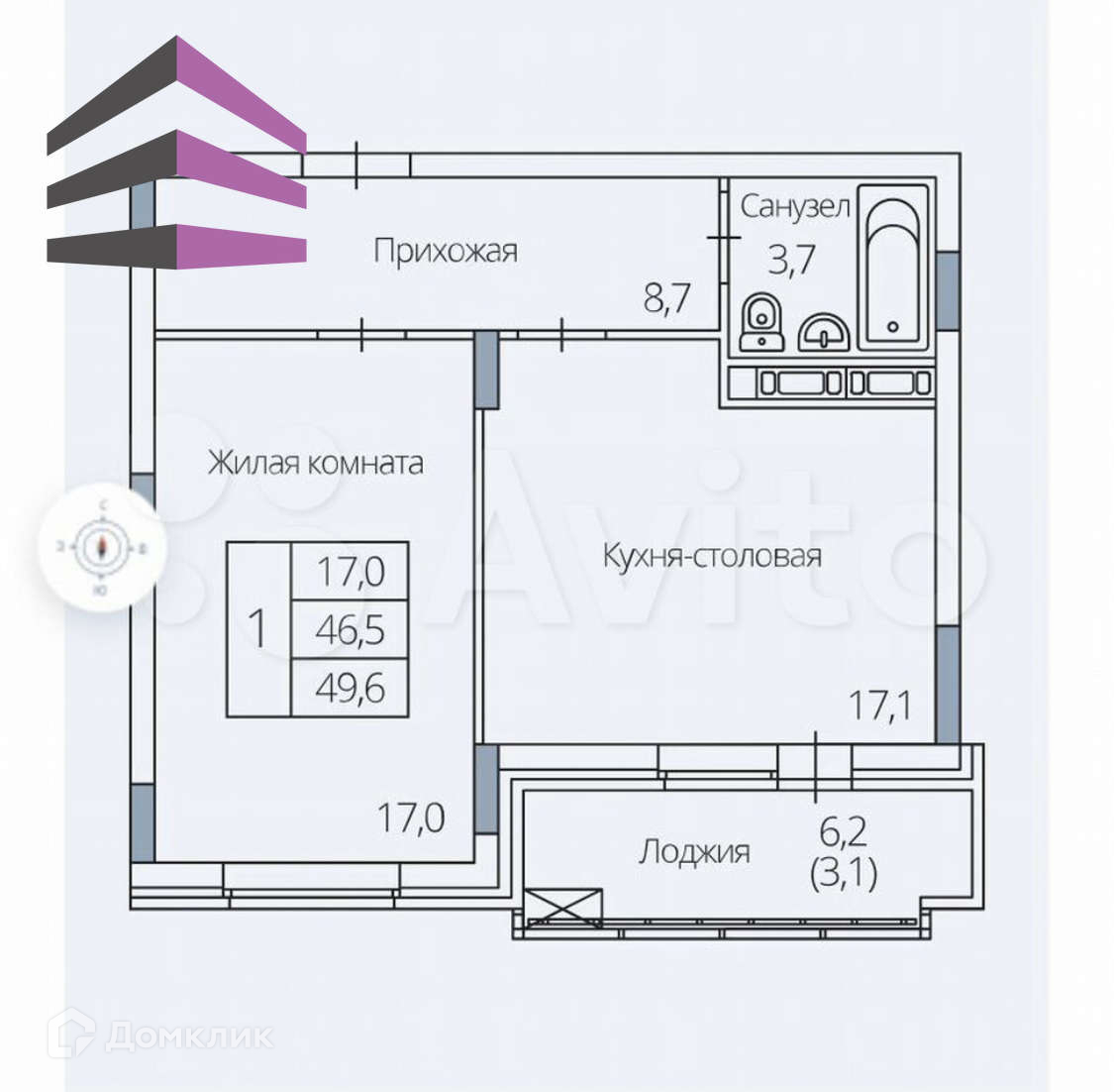 Общая площадь квартиры 49.6 кв.м, жилая-17.0 кв.м, кухня-гостиная с французским балконом-17.1 кв.м.