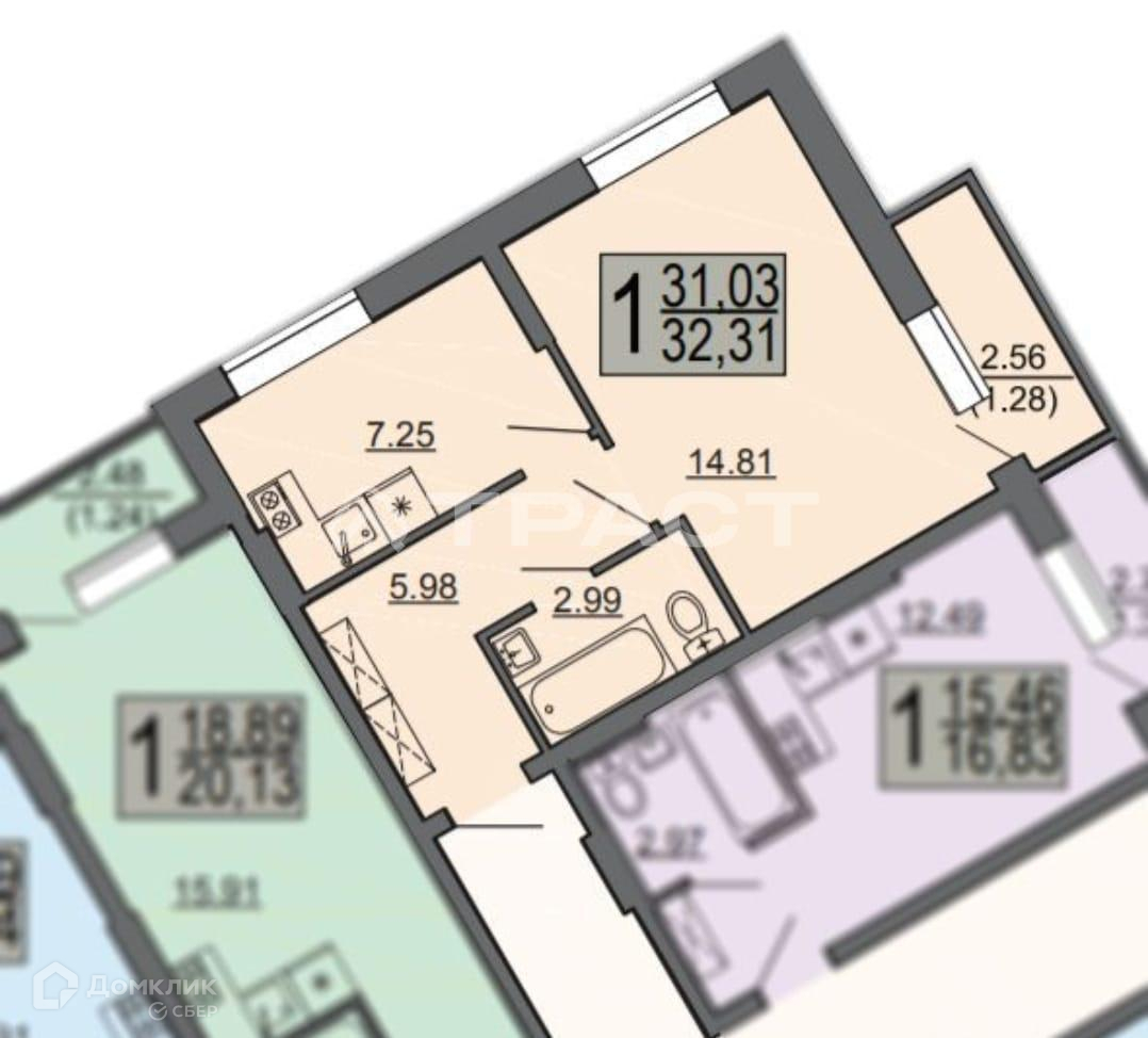 1-комнатная квартира, 32 м2, этаж 3 / 18, на продажу в Воронеже, Ростовская улица, 100БкА
