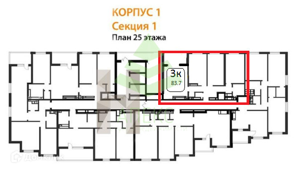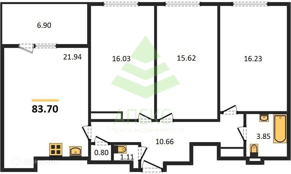 Продается 3к квартира площадью 83,7 м2.