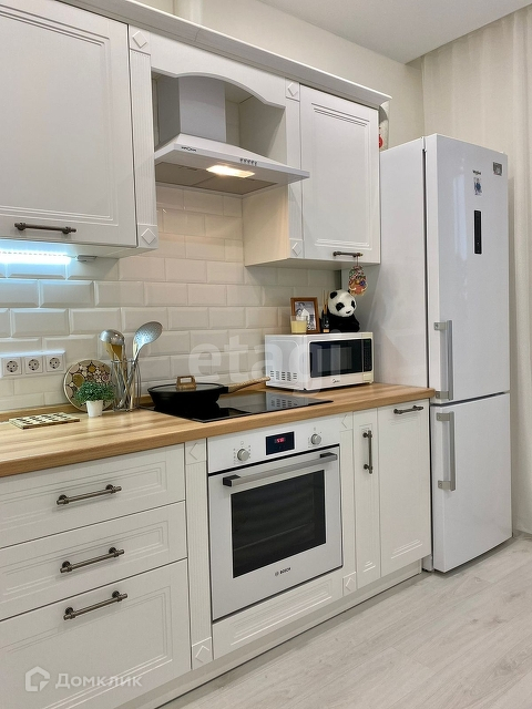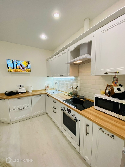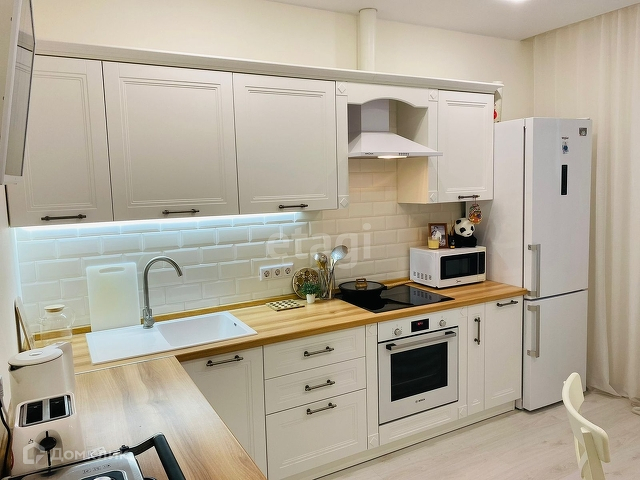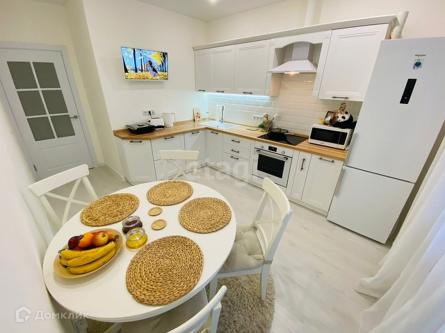 Кухня новая, остается варочная панель BOSCH, духовой шкаф BOSCH, холодильник, плазменный телевизор, чайник, стол и стулья IKEA, шторы. В подарок посуда, столовые приборы.