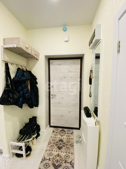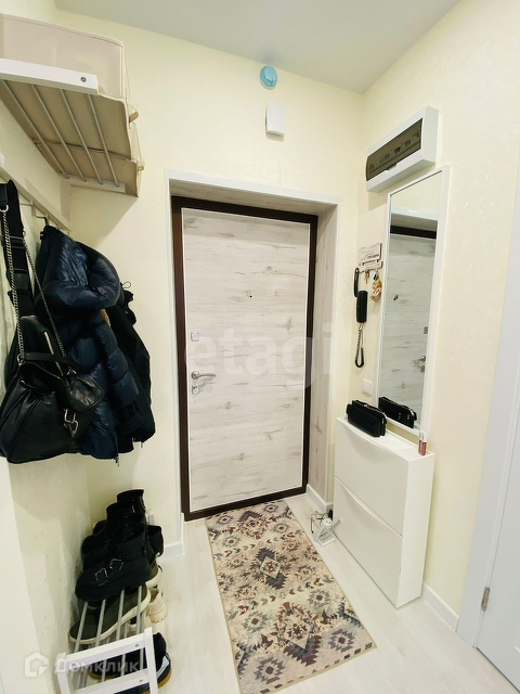 В прихожей зеркало, подставка для обуви, вешалка, обувница IKEA.