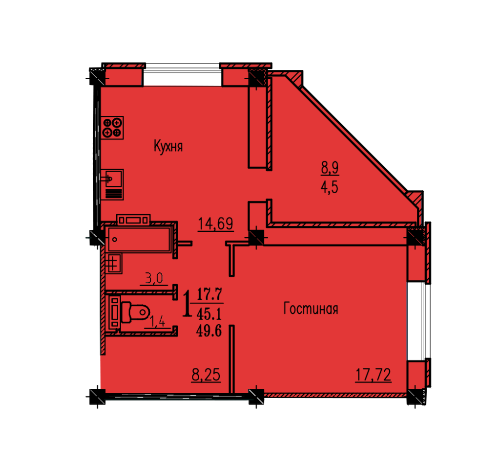 Общая площадь 44.5 м2