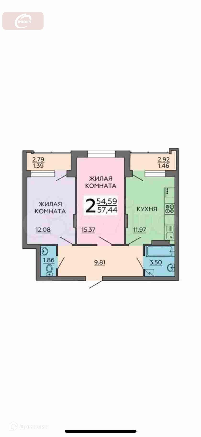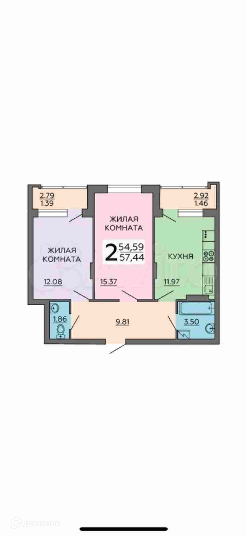 Общая площадь 57.4 м2