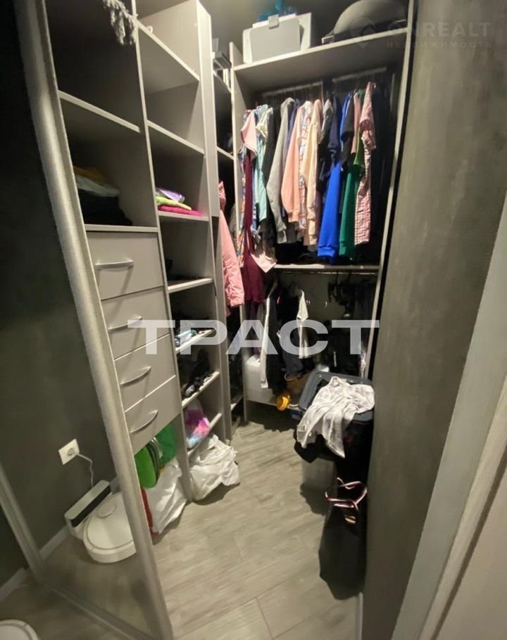 В гардеробной встроенны стеллажи для хранения одежды и прочего.